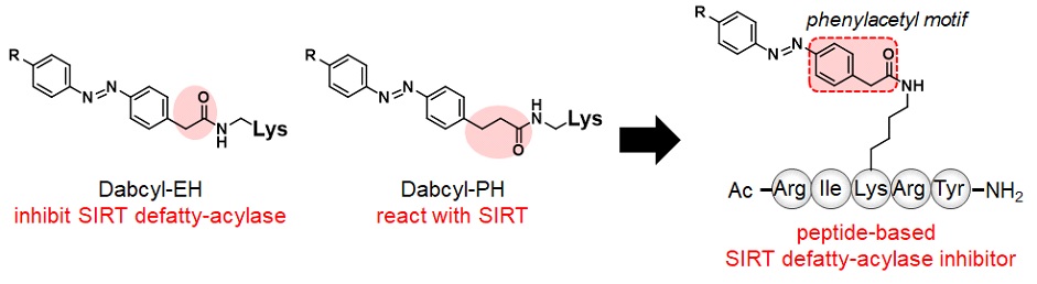 一方、このDabcyl基を用いた蛍光プローブの開発戦略はSIRTの脱アシル化阻害剤の開発にも応用できることが分かりました。つまり、Dabcyl-PH基はSIRTによって素早く加水分解されるのに対し、Dabcyl-EH基はSIRTによって加水分解されず、酵素反応を阻害するという興味深い結果が得られたため、この知見を基にペプチド性のSIRT脱アシル化阻害剤の開発に成功しました。本成果は、SIRTの脱アシル化活性が関与する疾患の治療薬開発に繋がることが期待されます。